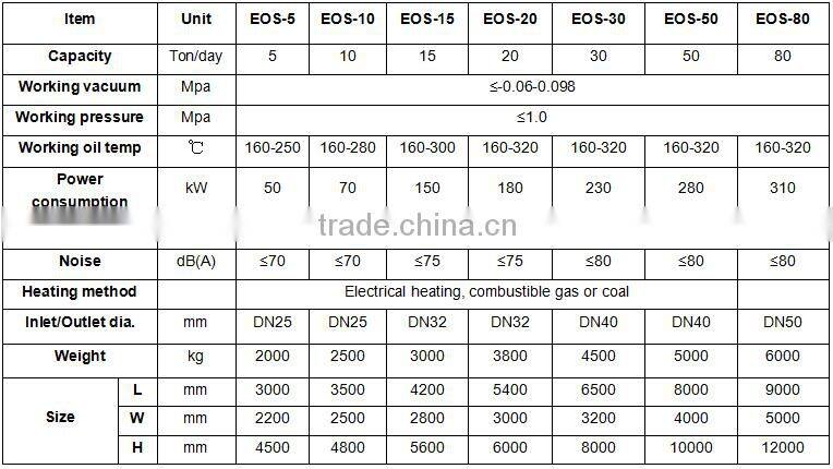 EOS is applicable for recycling engine oil, gear oil, hydraulic oil, form oil, rail oil, compressor oil, vacuum pump oil, axle oil, slideway oil, bearing oil, turbine oil, cylinder oil, drawing oil, conduction oil, quenching oil, insulation oil and rolling oil in industries of petroleum, chemical, cement, metallurgy, mining, electricity, shipbuilding, machinery, military, rubber, instrumentation, transportation, building materials, paper making etc.