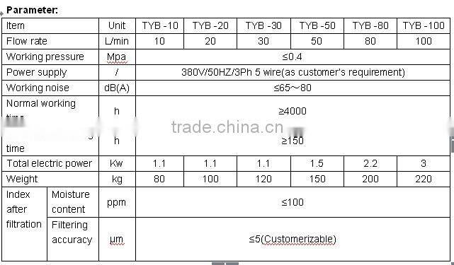 TYB adopts coalescence separation filter which integrates high precision filtration and high efficient demulsification and dehydration into one, and can remove large amount of water without heating. It has the fastest dehydrating speed in domestic. This machine can quickly separate water from oil though the water content reach 50%. The oil cleanness can reach NAS six grade. This machine is used conveniently with go-cart type design. It’s specially suitable for purifying high water content light oil, jet fuel, gasoline, kerosene, diesel, light and low viscosity lubricating oil .