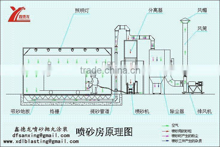 Performance: 1) It adopts large power air fan to provide air power for blasting booth. The air power will reclaim the mixture of abrasives and dust through honeycomb floor. Because the air flow goes topdown, the dust will be descent down to the floor. Thus it can provide good working conditions and visibility for workers. 2) It doesn't need dig pitch or dig shallow pitch and can reduce construction task, thus it can reduce invest amount. The frame of blasting room adopts steel structure; the outer of room adopts color steel plates; the sandwich adopts special quieter materials. It can reduce noise and control the noise level under 80db(A). 3) The compressed air pressure is 0.8Mpa; the de-rusting grade is Sa2.5~3; the dust emission density is ≤80mg/m3; the illuminance is ≥300Lx. 4) It adopts large volume sand/grit blasting machine, auto abrasive input system and can improve the efficiency by 40%~45%. 5) The blasting nozzle quantity is determined by the blasting area per hour provided by customers. 6) It adopts advanced pulse jet cartridge filter dust collector and has the advantages of high efficiency of dust removing, long life service and dust emission density less than 80mg/m3. 7) It adopts complete sets of blasting protective wearing. |