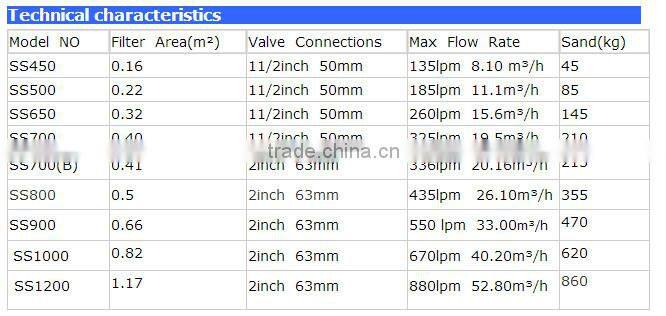 Model NO | Filter Area(m²) | Valve Connections | Max Flow Rate | Sand(kg) |
