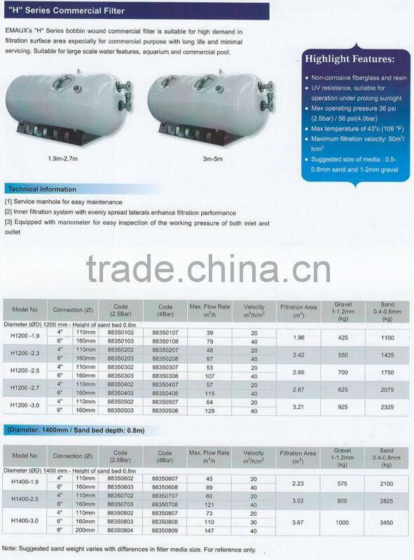 | H1400-1.9 | ¢ 1.4m*1.9m Length Horizontal Sand Filter. ¢ 4" Flange in/outlet. (2.23m2/h) |