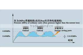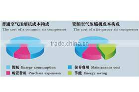 The figure shows the comparison of running condition between ordinary air compressor and inverter compressor. Frequency compressor work based on air consumption and air production balance, to avoid the machine loading and unloading frequently when the air consumption changing, it saves more than 35%energy compared to traditional compressor. steady pressure output, with the pressure loss control in 0.01Mpa-0.02Mpa, avoid the high load current loss which cased by the 0.05-0.2Mpa large pressure difference of tranditional compressor.
