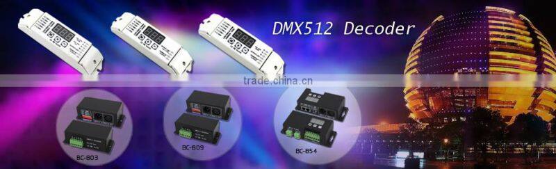 BC-854 the Constant Voltage DMX512 Decoder is developed only for constant voltage LED lamps. It adopted advanced micro-computer control technology to transfer standard DMX512/1990 signal to PWM signal. User can choose 1~4 output channels, 4096 Grey Scales. Multiple DMX512 signal interface.