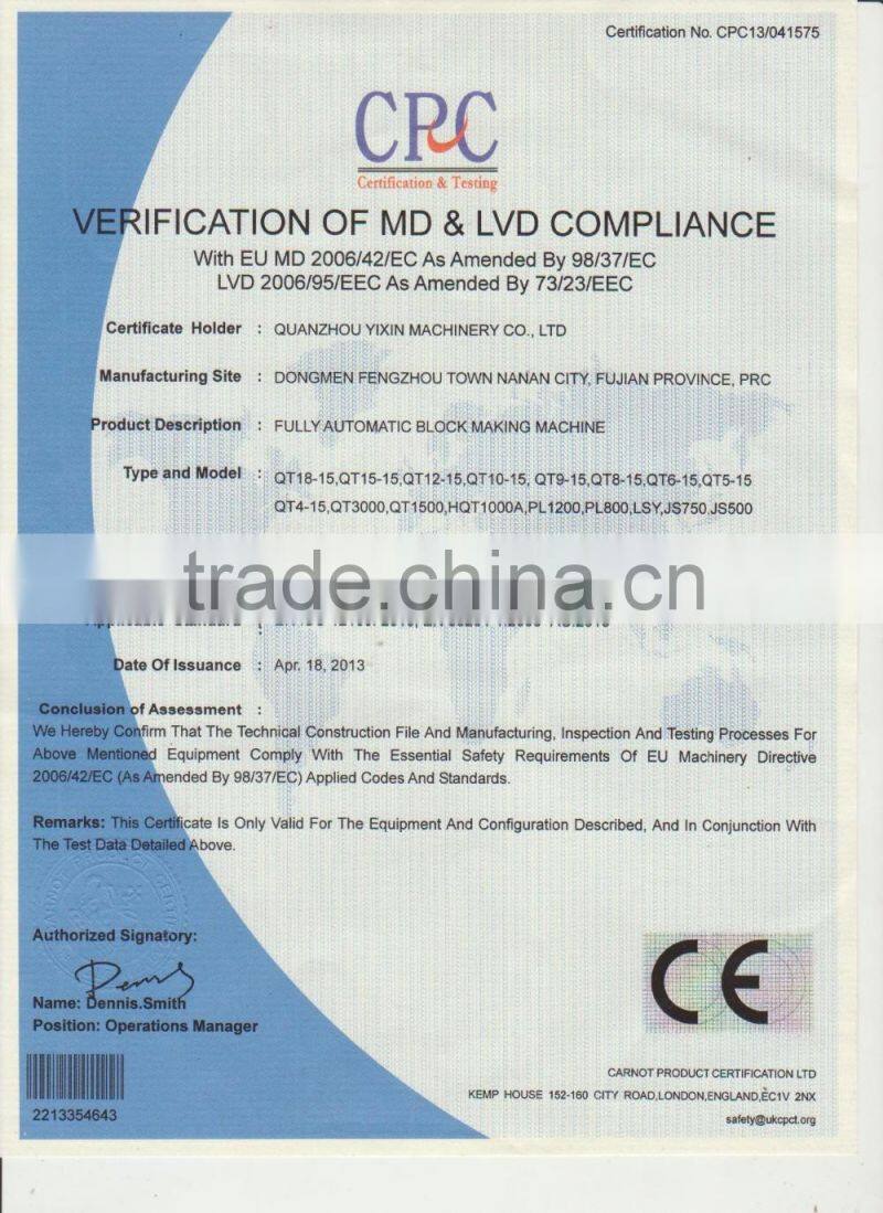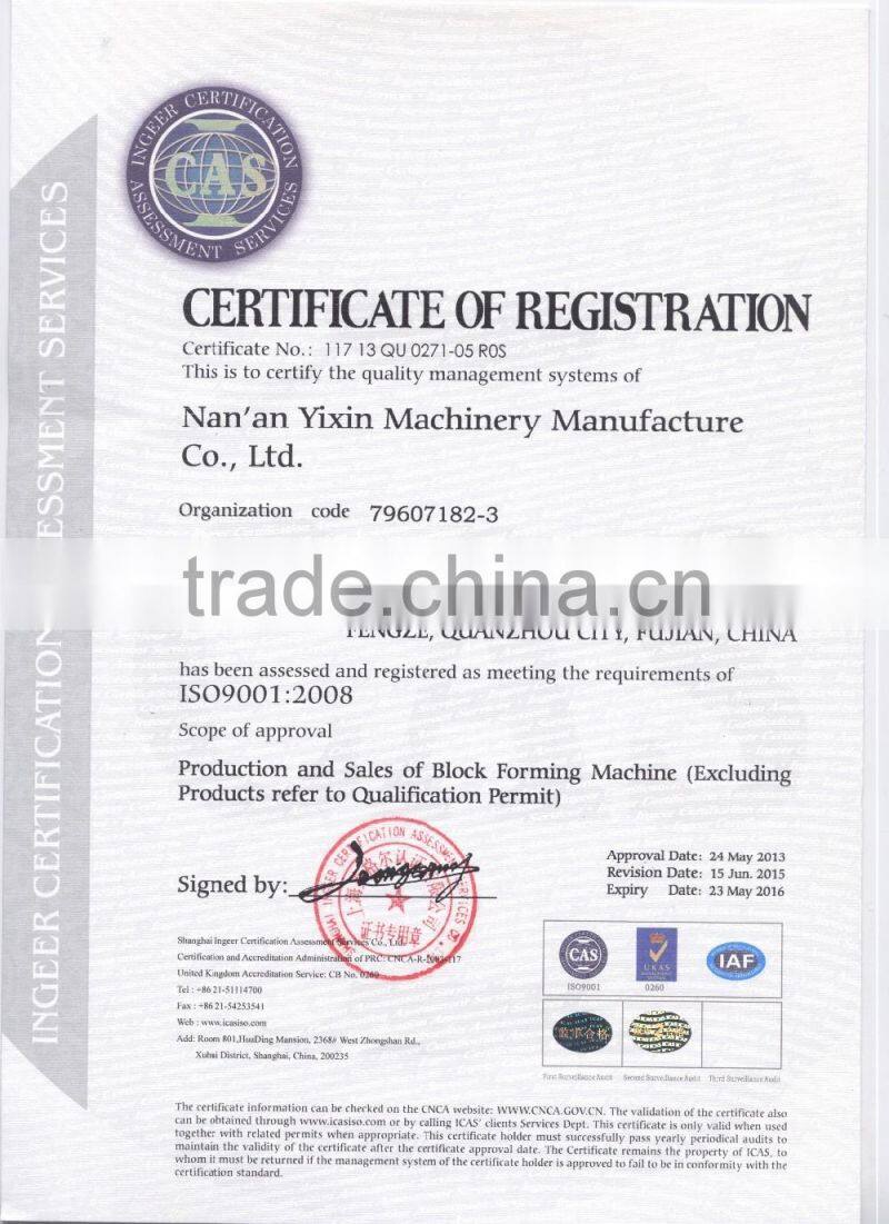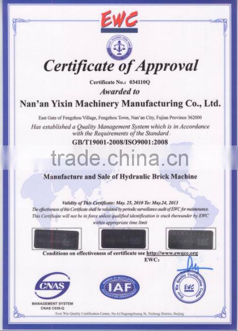 Yixin machinery has strong technical strength and complete sets of equipment,can design and product of various types of specifications for the customers,our block making machine passed the ISO9001:2000 Quality System Certification and also through the "CE" certification.