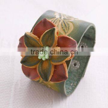 The bracelets are made with quality top-grain cowhide and are hand tooled by professional leather artists. What set the products apart from other manufactures are the vivid colors. These bracelets feature floral designs that match summer fashions and bold designs that are available in a wide variety of colors and intricate details on the flower petals and leaves for example. The bracelets feature two snaps and three sizes of 19, 20, and 21 cm (7.5, 7.9, 8.3 in) and eight colors (red, pink, blue, purple, green, brown, orange, and black).