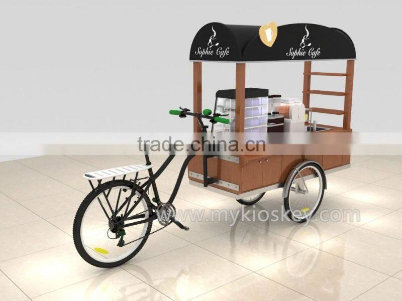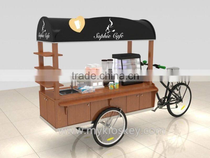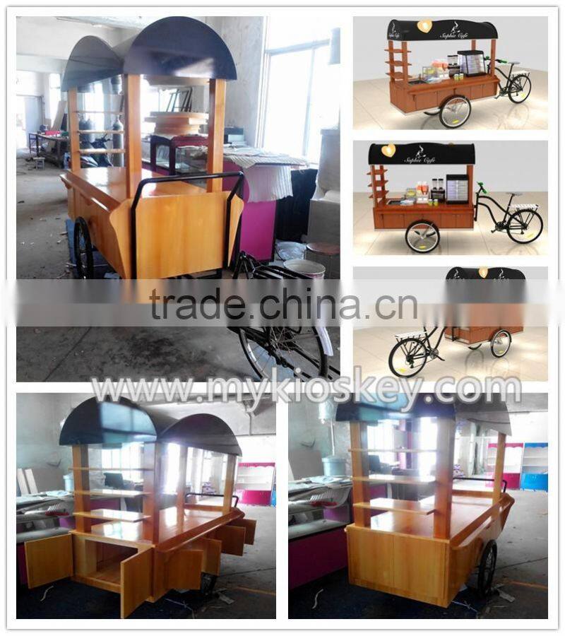 As you see this food cart, an used for outdoor selling coffee, main material is Solid wood, with a bike can moved easy. this kiosk with a single stainless steel sink, wooden shelf, a top, cabinet, all of anyhing about this cart can customized for you.