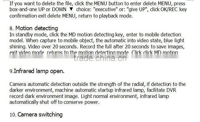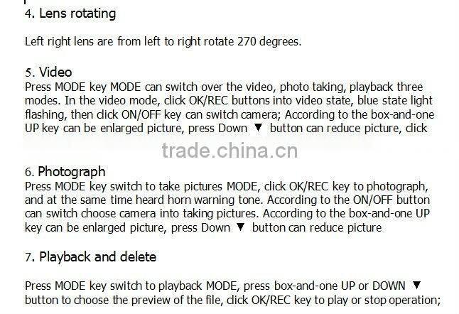 In the photos or video mode, click ON/OFF key can switch work camera, the factory is set to double set about camera work mode, click ON/OFF button, switch to the right camera work alone mode, click again to switch to the left camera work alone mode, again click switch to double camera work together at the same time according to the following order cycle mode: double camera right camera left camera double camera video state switch camera will save ON a video file.