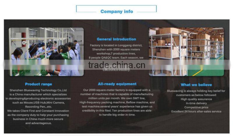 We are a professional manufacturer of 3C products.Including mouse,VR 3D Glasses,VR Cardboard,Mini Hidden Camera,USB Hub...etc.High Quality,Competitive Price and Excellent Service.We are always your best choice.Please feel free to contact me directly.