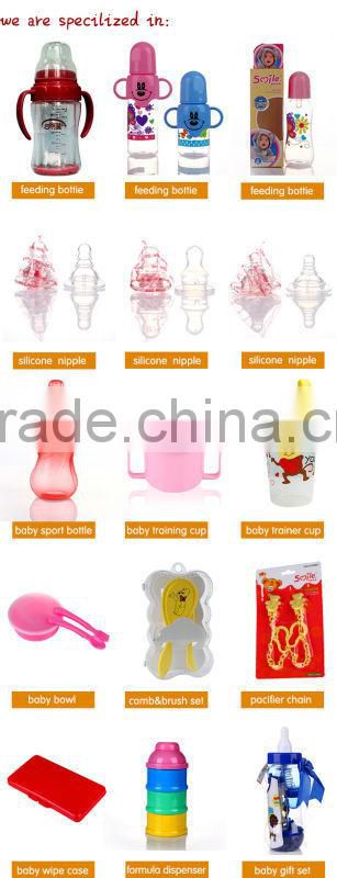 2,Our main products are baby bottle, baby nipple, sipply cup, pacifier, fork&spoon, comb&brush, plastic bow, baby bid, etc.