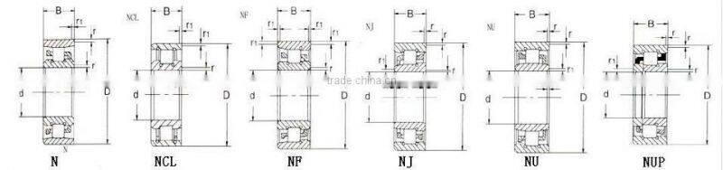 There are different types designated NU, NJ, NUP, N, NF for single-row bearings, and NNU, NN for double-row bearings depending on the design or absence of side ribs.