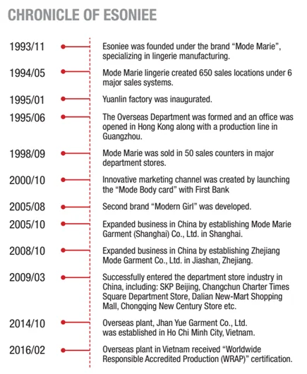 Esoniee International Co., Ltd., was founded in 1993 and in a registered the trademark of “Mode Marie” in Taiwan and France. It is currently one of the top 3 women’s boutique lingerie brands in Taiwan.