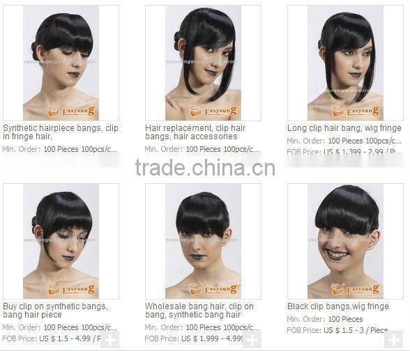 1. Easyoung's Main products: synthetic hair wigs(long or short wig, curly or straight wigs) , claw clip ponytail hair pieces, drawstring ponytail hair pieces, clip in hair extensions, hair Scrunches, chignon hair pieces, hair buns, men's wig, toupee, half wigs, party wigs, costume wigs , Child and Tween wigs, hair fringe and bangs , synthetic hair weave and weft and other hair accessory