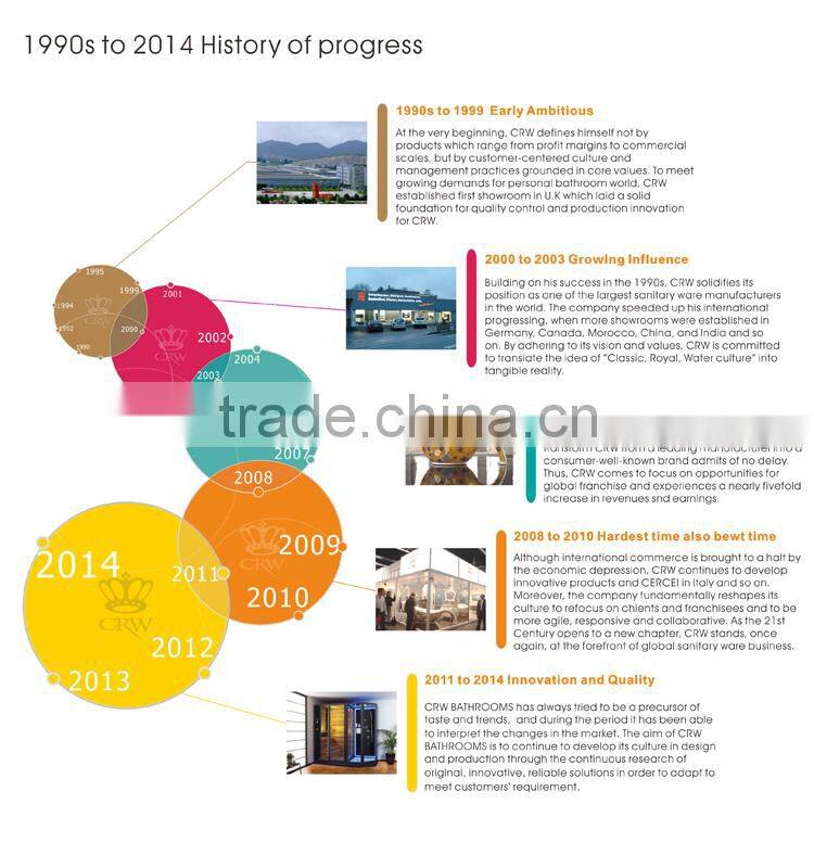 CRW Bathrooms, established in 1996, has become one of the leading sanitary ware manufacturers and marketer in Asia with our 190,000 sqm production base, 400,000 sqm ceramics factory under construction and 6000 sqm new headquarter. CRW commits ourselves to a complete bathroom solution covering such categories as Steam Cabinet, Bathtub Series, Shower Enclosure, Shower Panel, Bathroom Cabinet, Ceramic Series and Accessories, just to meet various needs from different consumers across the world.