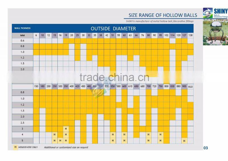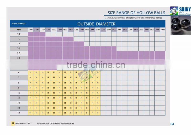 Shiny (Cysoar stainless steel products co,ltd) is specialized in Manufacturing Hollow metal ball.Hollow Brass Ball.Fire Ball. Garden Gazing ball/sphere, Hollow Aluminum Ball,Metal Hemisphere, Large Garden Ball/sphere,Metal Globe, Christmas steel products,Customized Metal Works.we can also provide customized service (Etching&Knurling,Bending&Rolling,Powder Coating/electroplating,)