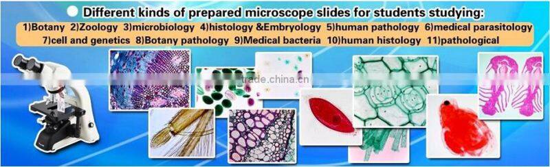 We can supply you botany , bontany pathology , zoology , medical parasitology , histology ,human pathology , oral pathology , animal pathology , cell and genetics , embryology ,microbiology and many other kinds of prepared slides.