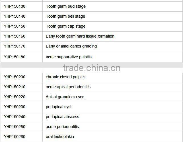 Prepared slides more than 8000 kinds, the typesincluding: Botany, Zoology, Histology, Parasitology, oral pathology,human pathology , Human Pathology, Embryology,Cell biology & Genetics, Microbiology and so on .