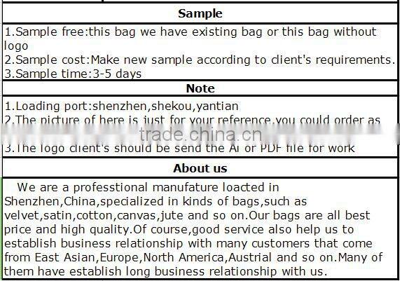 Shenzhen Yuanjie Packing Product Co., Ltd was establish in 2004, mainly do export business. For ten year manufacture experienced, it earned a good reputation among overseas . Our company spcialize in all kind of packing bags, such as velvet bags, cotton bags,jute bags, mesh bags,leather bags, organza bags, stain bags, which can be used as gift, decroration, barrier, protector.