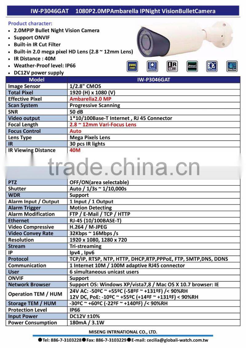 IW-P3046GAT Bullet 2.0MP 2.8~12mm Lens Auto focusing IR 40m ONVIF