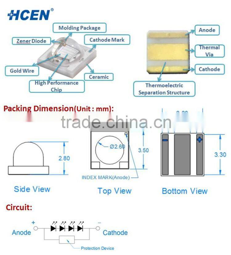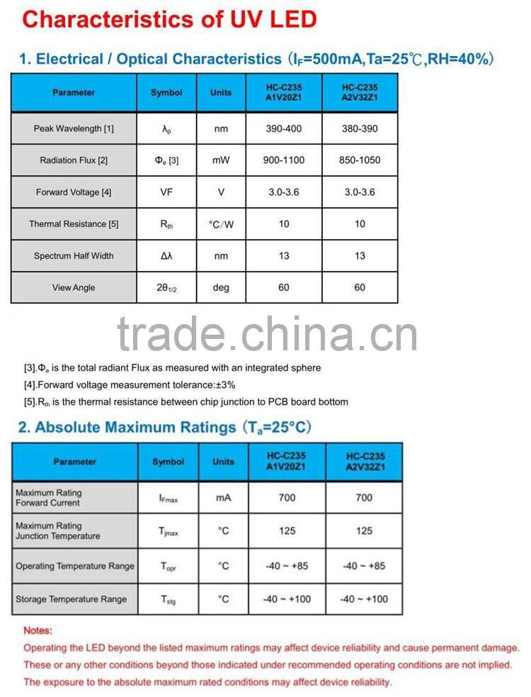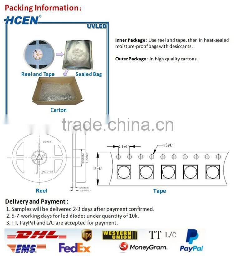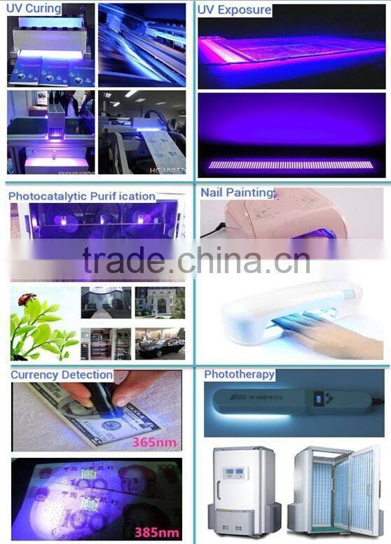HCEN UVA LED can be widely applied for UV curing, UV exposure machine, fluorescent spectroscopy ,currency detection, nail painting, UV mosquito lamp, medical phototherapy,Bio-analysis/detection and other fileds.