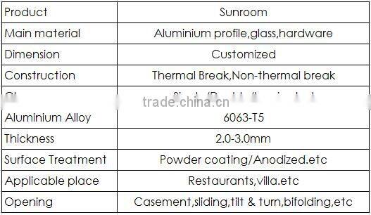 Aluminum glass house are beautiful, big aluminum frames, glass is large, vision, lighting rate, flexible, safe and reliable, long service life. Aluminum sunroom have the advantage not to occupy the interior space, the appearance of beautiful, affordable, sealing well. High-grade slide, and improve the overall appearance of the building.