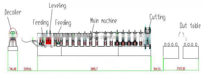 Manual decoiler→ feeding→flattening→ roll forming→post cutting →output table