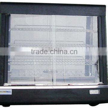 1. This product has adjustable 3-trays display, 4-sides of glass.Features: Thermostat with monitor can make temperature with monitor can make temperature in the warmer be even. This machine can supply humidity by its system to keep food be wet.