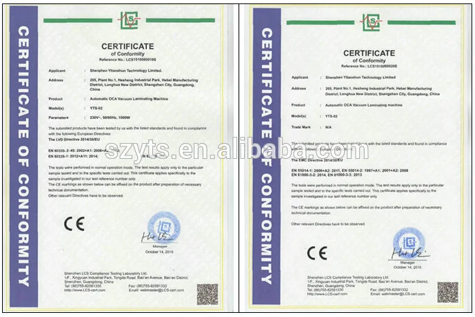 3.Lamination speed:15 seconds/4pcs LCD.4. Certification: CE Certificate and Patent certificate