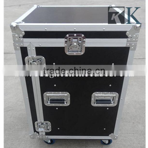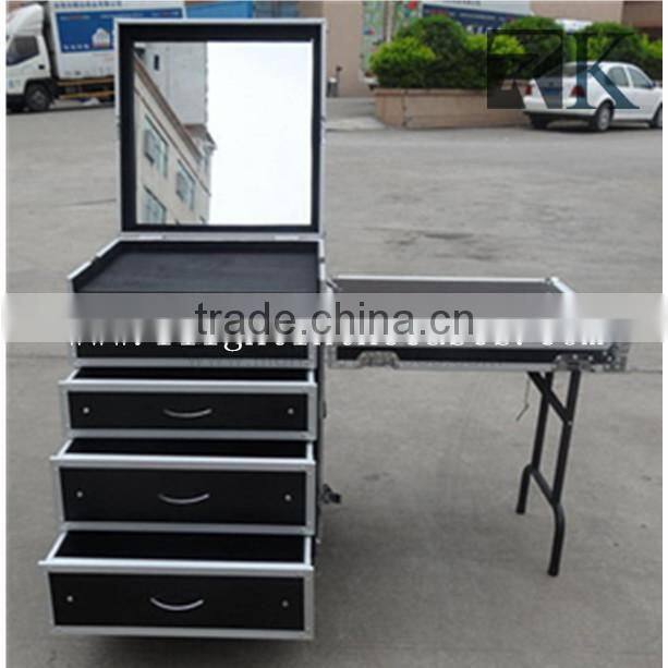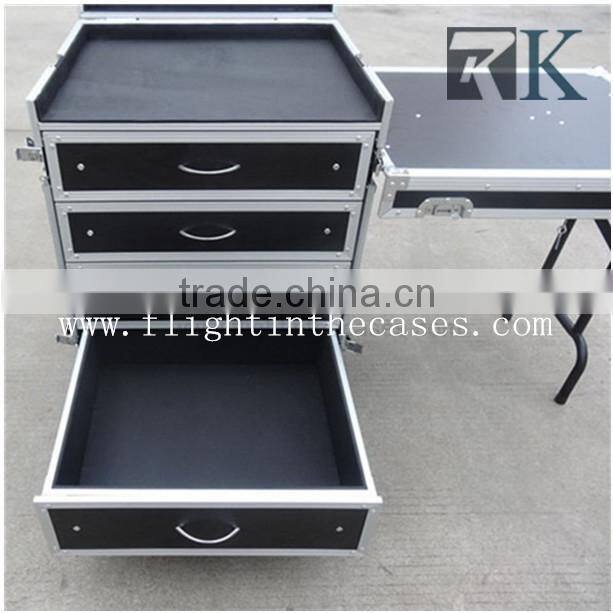 Our RK multi-functional drawer case is constructed of 12mm plywood.It features: ball corners, aluminum on all edges, heavy duty recessed spring-loaded handles and 4" easy glide casters. This utility case features drawers for storage and a table attachment on the front cover.