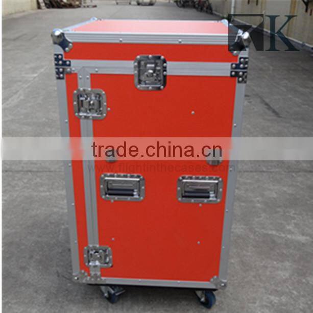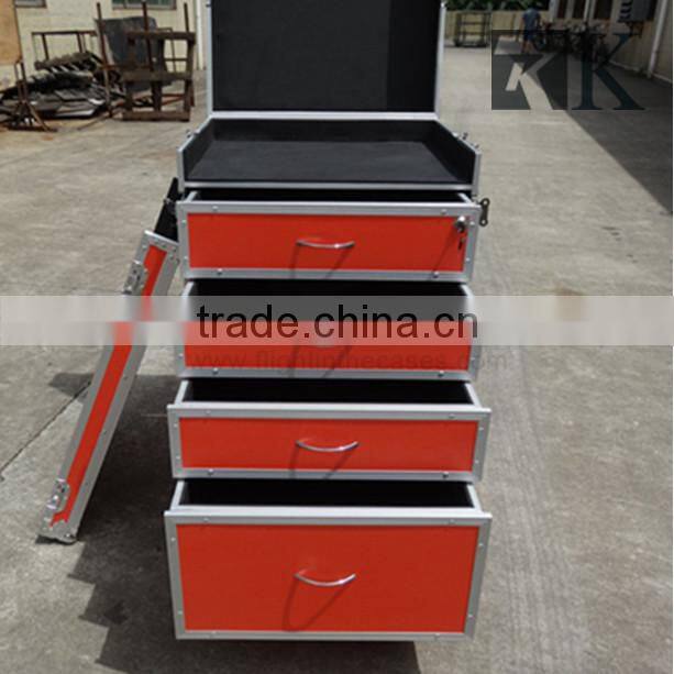 Our RK multi-functional drawer flight case is constructed of 12mm plywood.It features: ball corners, aluminum on all edges, heavy duty recessed spring-loaded handles and 4" easy glide casters. This utility case features 8 drawers for storage and a table attachment on the front cover.