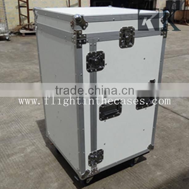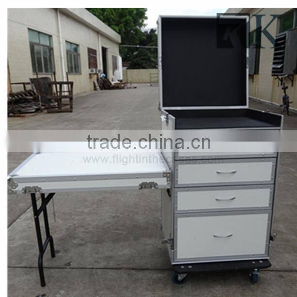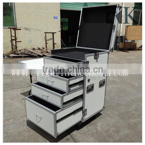 Our RK multi-functional drawer flight case is constructed of 12mm plywood.It features: ball corners, aluminum on all edges, heavy duty recessed spring-loaded handles and 4" easy glide casters. This utility case features 4 drawers for storage and a table attachment on the front cover.