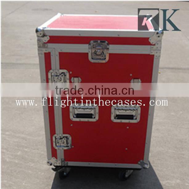 Our RK multi-functional makeup case with drawers is constructed of 9mm plywood.It features: ball corners, aluminum on all edges, heavy duty recessed spring-loaded handles and 4" easy glide casters. This utility case features drawers for storage and a table attachment on the front cover.