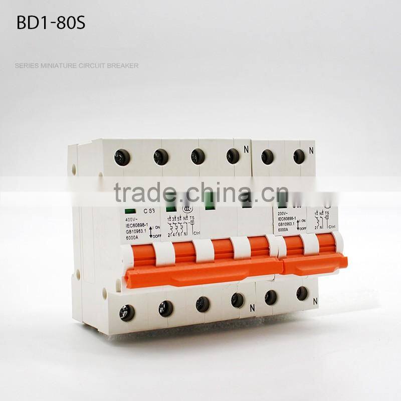 BD1-80S series mini circuit breaker with shunt tripping apparatus which owns the intelligently shunt tripping function, and is applicable in AC50Hz/60Hz, rated voltage 230V/400V and rated current up to 80A. It can do remote control or control the breaking by automatic signal, and at the same time can stop the circuit from overloading and short circuit. It also can do the unfrequent operating to the circuit. At present, it is widely used in supporting equipment to control the ON and OFF of the circuit for IC card prepayment watthour meter.