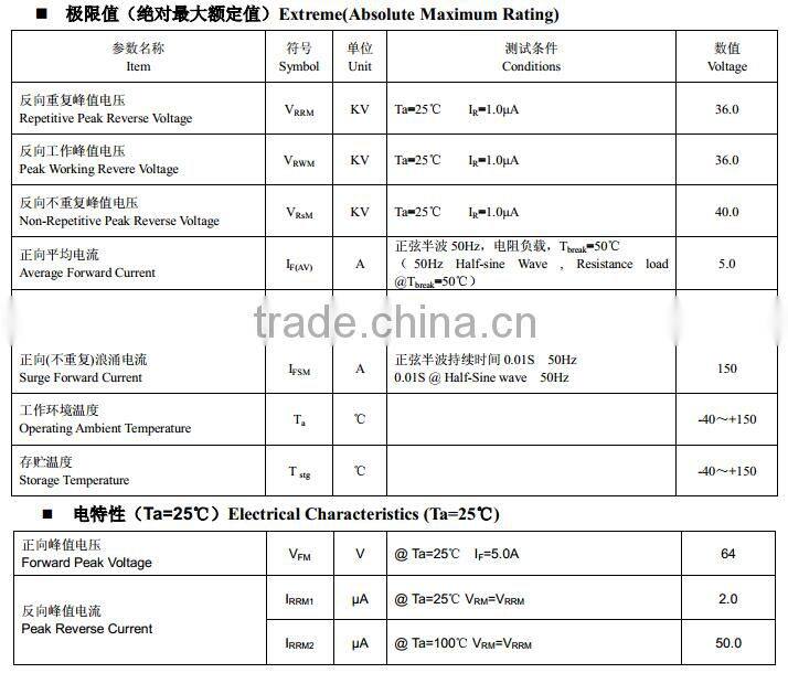 | Max. Reverse Voltage | 36KV | Max. Forward Current | 5.0A | |