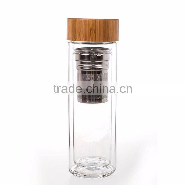2016 New High Boronsilicon Double Layer Bamboo Cover Glass Water Bottle Gifts Cup With Tea Funnel Thick Heat Insulation Bottle