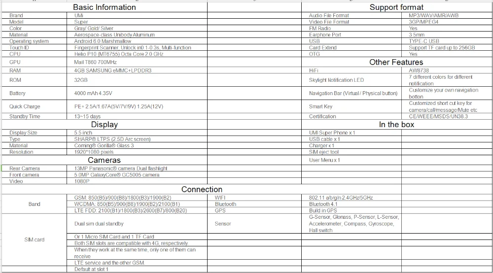 Newest Sale Original UMI Super 5.5" 4G FHD Mobile Phone 4GB RAM/32GB ROM 5MP/13MP Flash LED 4000mAh Android 6.0