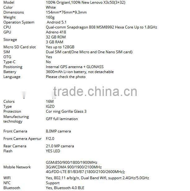 Original Lenovo Lemon Vibe X3 C50 5.5'' 1920X1080px Snapdragon-808 HexaCores MSM8992 3GB+32GB RAM+ROM 21.0MP+8.0MP Camera Dual SIM 3600mAh FDD LTE