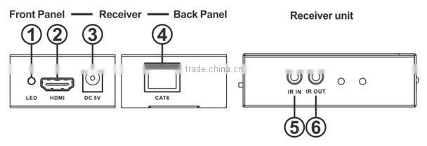 4. CAT6:Connect the CAT input of the receiver with the CAT output of the transmitter with CAT5E/6 cable.