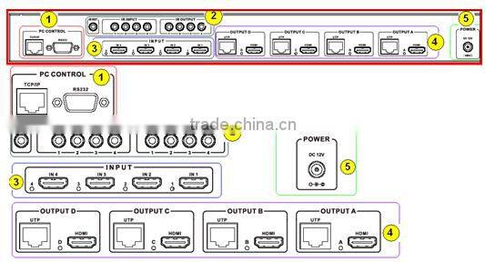 - Input Ports 4×HDMI, 4×IR Extender, 1×RS-232, 1xRJ-45(Control),1xMatrix IR Extender