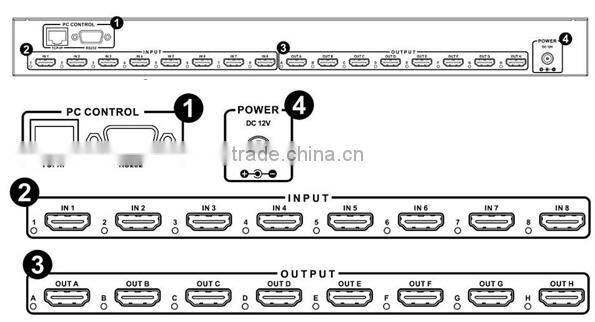 2.HDMI INPUT Area:Connect HDMI sources. LED 1-8 illuminate when the HDMI signal plug in corresponding input port with HDMI cable.