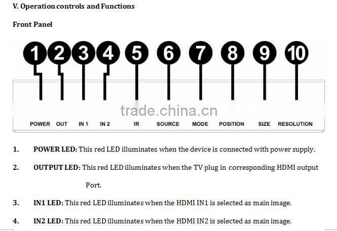 - 2. SOURCE: Press the button to select the input source as main image, and the LED will indicates the corresponding input source.