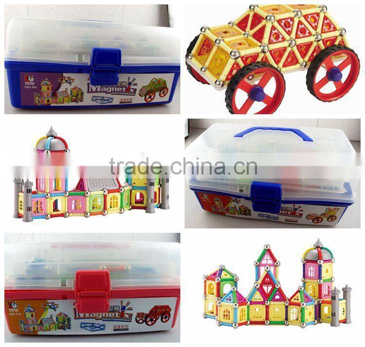 | Composing | Magnetic bar 290pcs + bent bar 12pcs + magnetic car 5pcs + steel ball 182pcs +circle 3pcs + triangle 166pcs + square 130pcs + rhombus 24pcs + pentagon 8pcs + hexagonal 4pcs + triangle window 8pcs + arc window 8pcs + cross bar 3pcs + tile 3pcs + pillar 6pcs + roof 3pcs + small roof 3pcs + chimney 3pcs + iron ring 8pcs + wheel 4pcs + rubber band 4pcs + screw 4pcs + screw nut 4pcs + chassis 1pcs + axletree 2pcs + specification 1pcs | ||