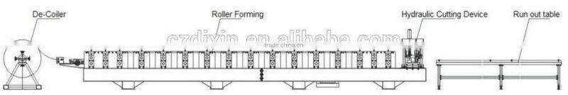 Uncoiling→Feeding material into machine→Roll forming→Measuring length→ Step formed→ Auto cutting→Products receiving