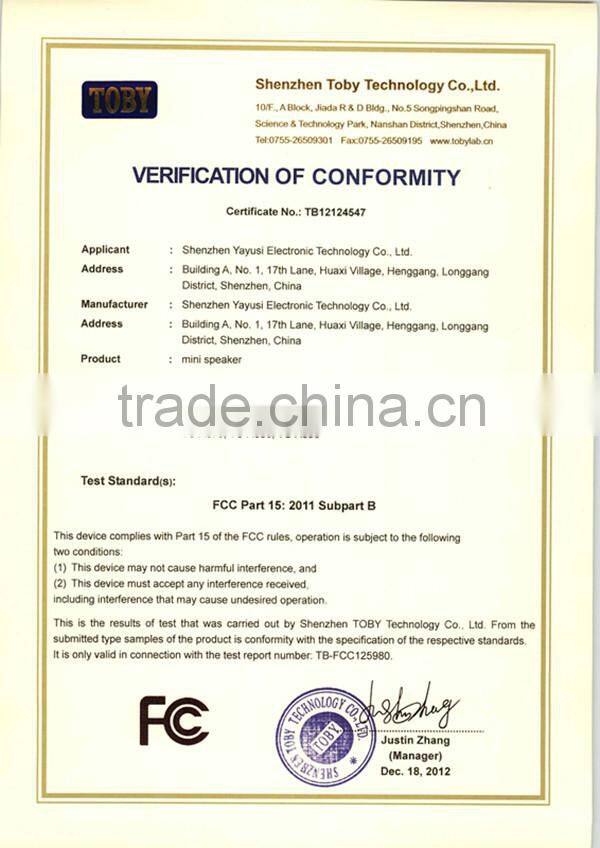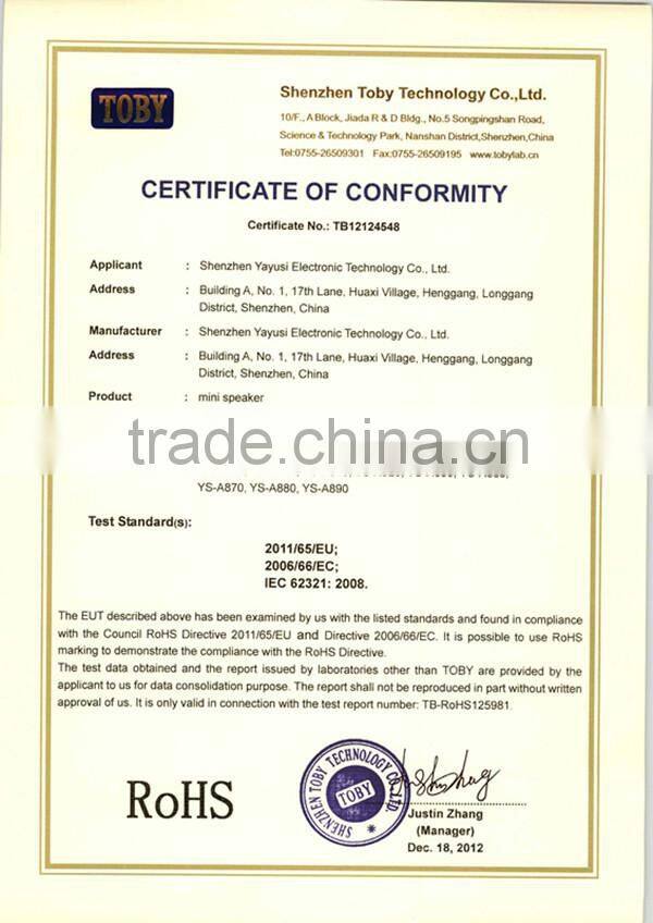 Having 4,000 square meters workshop and more than 100 hundreds workers, 1.5 million sets speaker can be reached per year. Equipped with perfect R&D, production, testing equipment, and a group of high quality personnel, we gained good reputation by our exquisite design, consistent quality, reasonable price and excellent service. By years of striving, we have made our own brand YAYUSI very popular in China and have won many customers' trust at home and abroad. Most of our products are original design and patented. To fulfill the increasing market demand, we push our own brand in China meanwhile offer OEM/ODM service for overseas Customers. ISO9001 quality management system is operated strictly and most of our products have got CE, FCC, RoHs approval.
