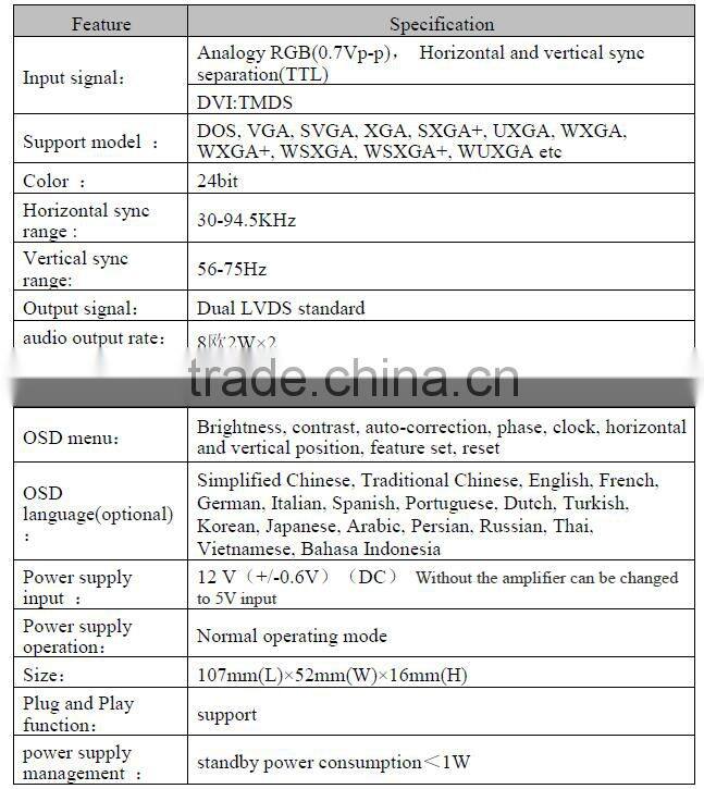 Product Specification for Cheap Price VGA DVI LCD Driver Controller Mother Main Board