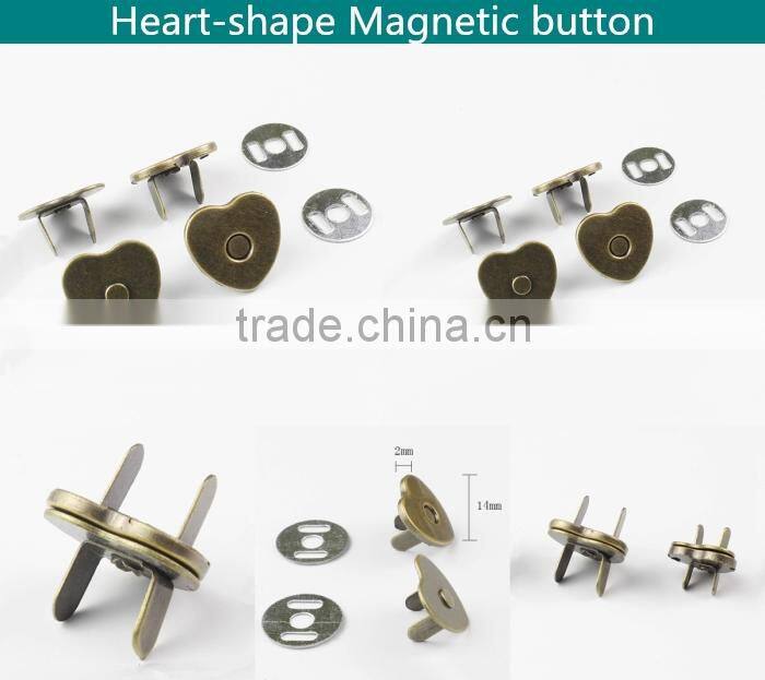 Magnetic button is composed of female , male ,washers(double rivet magnetic button don't need washers). Female contains the magnet,covered by shell(brass material) ,material of male is iron , washers are made of alloy.