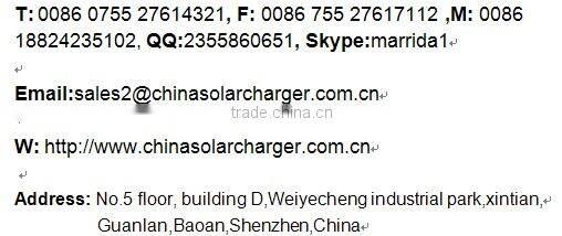 This product is a multifunctional solar charger, with dual output(5V&9V~18V) which can charge for 18V products, 12V battery and 5V Iphone/Ipad, PDA, MP3, MP4, digital camera, video camera, PSP video games, iPhone,Blackberry , blue-tooth headset, IPOD etc at one time. Foldable design,Graceful appearance, delicate and cabinet,Convenience to take , fashionable elegance. USB interface output can be suitable for most digital products, Especially suitable for anywhere can obtain sunshine, realize high-efficient charging, use convenient and safe, environmental protection, energy saving.It is good for promotion, sales, gifts etc.