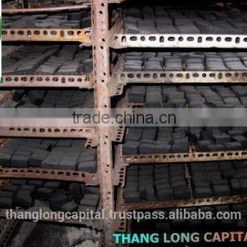 We grind kilned coconut shell into small pieces, mix it with botanical adhesive and use Hydraulic press or extrusion machine to make finished charcoal.