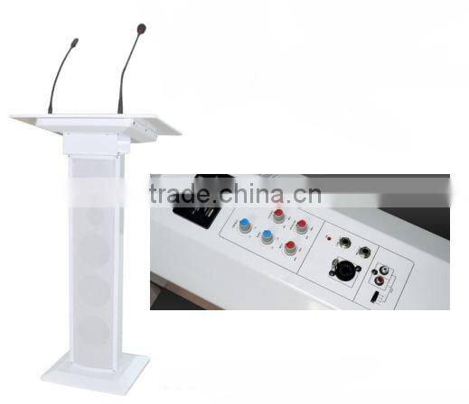 Luxury lectern suitable for speeches,teaching and conferences;built-in three bass speakers;rated output power 60W,built-in microphone and a small lamp lighting,wireless receiver with two MICS.