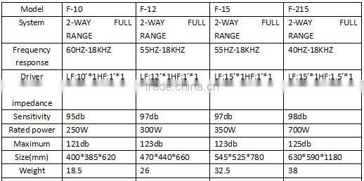 | Driver | LF:10"*1/HF:1"*1 | LF:12"*1/HF:1"*1 | LF:15"*1/HF:1"*1 |