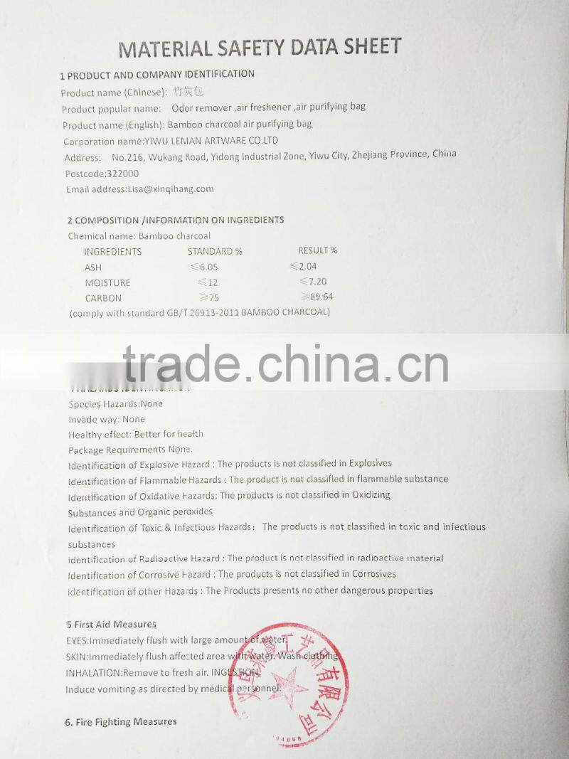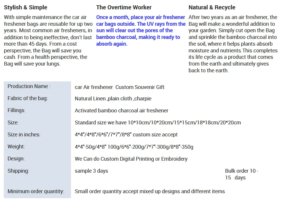 The bamboo charcoal air freshener is flammbel products not accept shipping bulk order by express . For the sample we will shipping by HK DHL door to door